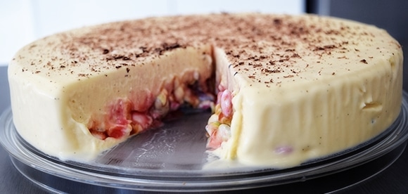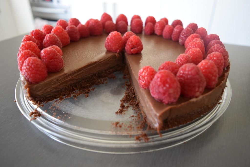 Remove the lid and decorate with raspberries. Remove sleeve from the base, cut & serve