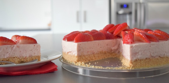 Pour in the strawberry mousse leaving 5cm from the outer sleeve.