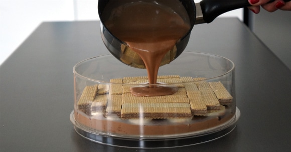 Place chocolate waffles first and pour in chocolate mixture then a layer of bananas, repeat the process of waffles and chocolate.